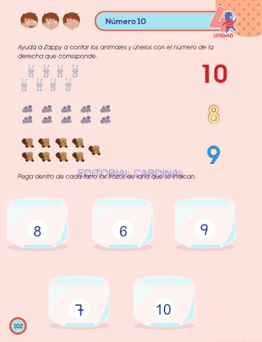 Número 10 UNIDAD Ayuda a Zappy a contar los animales y únelos con el número de la derecha que corresponde. 10 8 9 EDITORIAL CARDINAL EDITORIAL CARDINAL Pega dentro de cada tarro los trozos de lana que se indican. 8 6 10 102