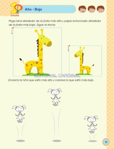 Alto - Bajo UNIDAD Pega lana alrededor de la jirafa más alta y papel entorchado alrededor de la jirafa más baja. Sigue la fecha. EDITORIAL CARDINAL EDITORIAL CARDINAL Encierra la niña que saltó más alto y colorea la que saltó más bajo. 19
