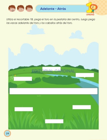 Adelante - Atrás UNIDAD Utiliza el recortable 1B, pega el toro en la pestaña del centro, luego pega las vacas adelante del toro y los caballos atrás del toro. EDITORIAL CARDINAL EDITORIAL CARDINAL 24