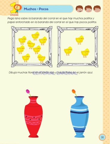 Dibuja muchas flores en el jarrón rojo y pocas flores en el jarrón azul.