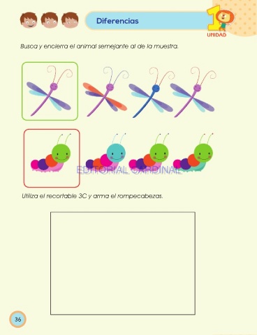 Diferencias UNIDAD Busca y encierra el animal semejante al de la muestra. EDITORIAL CARDINAL EDITORIAL CARDINAL Utiliza el recortable 3C y arma el rompecabezas. 36