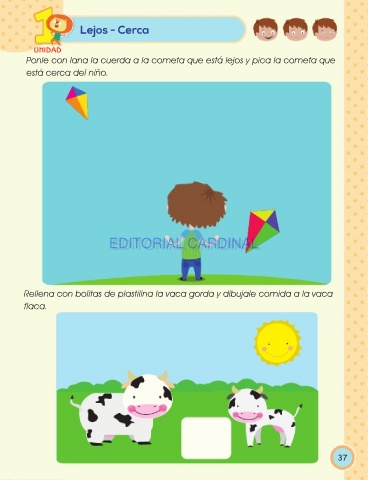 Lejos - Cerca UNIDAD Ponle con lana la cuerda a la cometa que está lejos y pica la cometa que está cerca del niño. EDITORIAL CARDINAL EDITORIAL CARDINAL Rellena con bolitas de plastilina la vaca gorda y dibujale comida a la vaca flaca. 37
