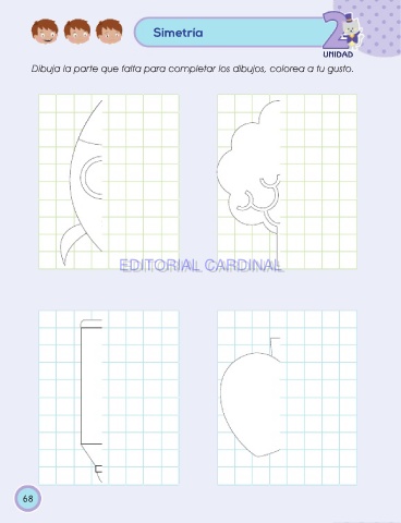 Simetría UNIDAD Dibuja la parte que falta para completar los dibujos, colorea a tu gusto. EDITORIAL CARDINAL EDITORIAL CARDINAL 68
