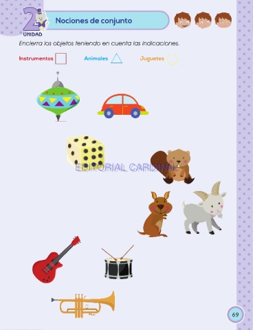 Nociones de conjunto UNIDAD Encierra los objetos teniendo en cuenta las indicaciones. Instrumentos Animales Juguetes EDITORIAL CARDINAL EDITORIAL CARDINAL 69