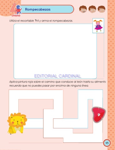 Rompecabezas UNIDAD Utiliza el recortable A y arma el rompecabezas. EDITORIAL CARDINAL EDITORIAL CARDINAL Aplica pintura roja sobre el camino que conduce al león hasta su alimento recuerda que no puedes pasar por encima de ninguna línea. 95