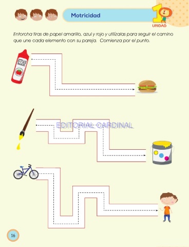Motricidad UNIDAD Entorcha tiras de papel amarillo, azul y rojo y utilízalas para seguir el camino que une cada elemento con su pareja. Comienza por el punto. EDITORIAL CARDINAL EDITORIAL CARDINAL 16
