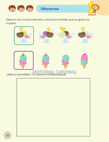 Diferencias UNIDAD Observa con mucha atención y encierra el helado que es igual a la muestra. EDITORIAL CARDINAL EDITORIAL CARDINAL Utiliza el recortable 1A y arma el rompecabezas. 20
