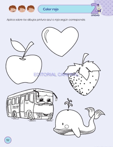 Color rojo UNIDAD Aplica sobre los dibujos pintura azul o roja según corresponda. EDITORIAL CARDINAL EDITORIAL CARDINAL 52