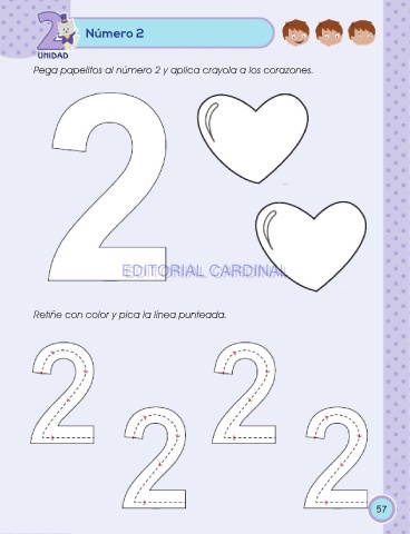 Número 2 UNIDAD Pega papelitos al número 2 y aplica crayola a los corazones. EDITORIAL CARDINAL EDITORIAL CARDINAL Retiñe con color y pica la línea punteada. 57