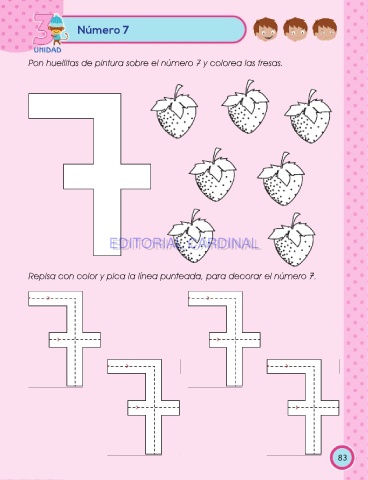 Número 7 UNIDAD Pon huellitas de pintura sobre el número 7 y colorea las fresas. EDITORIAL CARDINAL EDITORIAL CARDINAL Repisa con color y pica la línea punteada, para decorar el número 7. 83