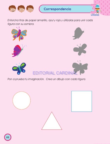 Correspondencia UNIDAD Entorcha tiras de papel amarillo, azul y rojo y útilizalas para unir cada figura con su sombra. EDITORIAL CARDINAL EDITORIAL CARDINAL Pon a prueba tu imaginación. Crea un dibujo con cada figura. 88