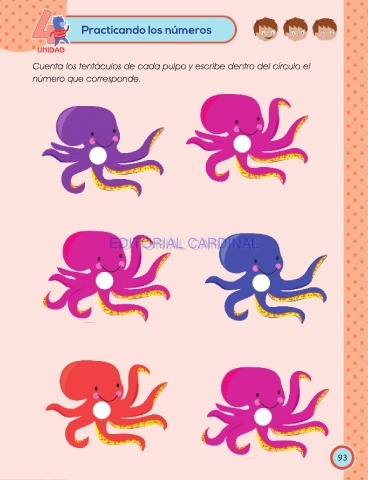 Practicando los números UNIDAD Cuenta los tentáculos de cada pulpo y escribe dentro del círculo el número que corresponde. EDITORIAL CARDINAL EDITORIAL CARDINAL 93