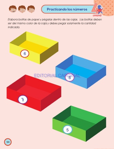 Practicando los números UNIDAD Elabora bolitas de papel y pégalas dentro de las cajas. Las bolitas deben ser del mismo color de la caja y debes pegar solamente la cantidad indicada. 6 EDITORIAL CARDINAL EDITORIAL CARDINAL 8 5 94